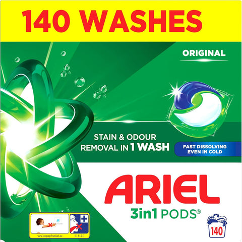 Ariel Original All-in-1 PODS Washing Capsules (140 Washes) are pre-measured laundry detergent pods designed to deliver powerful, all-in-one cleaning performance for your laundry. Each capsule contains a concentrated formula that cleans, lifts stains, brightens and freshens clothes even in cold washes thanks to Ariel’s advanced technology.