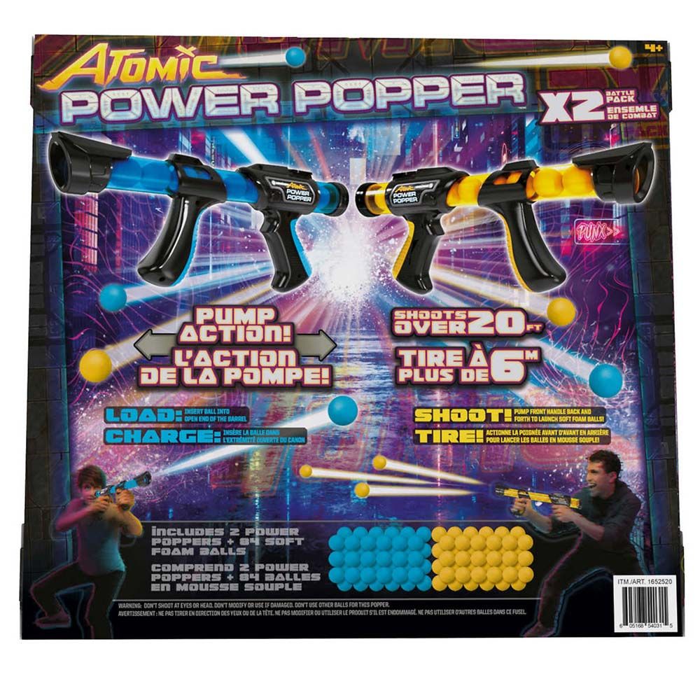 This Atomic Power Popper battle fires 12 soft foam balls in rapid succession: up to 20 feet. It includes 42 foam balls for each team (84 total) so you can take your battles indoors and outdoors. Choose your team and power to victory! Fires 12 soft foam balls in rapid succession! Shoots 20 feet with super fast re-loads. Take your battles indoors and outdoors. 84 balls for the ultimate battle.