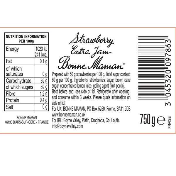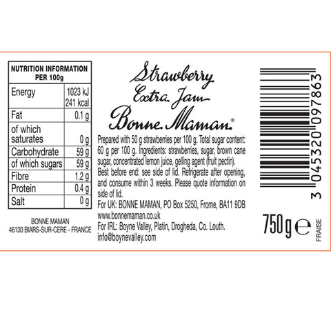- Each jar of Bonne Maman Strawberry Preserves features an abundance of their trademark pieces of fruit.
