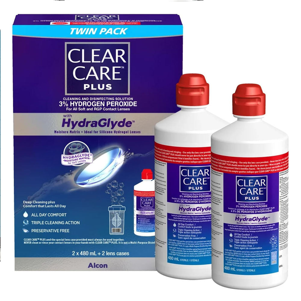 Clear Care Plus With HydraGlyde, Cleaning And Disinfecting Solution 3% Hydrogen Peroxide For All Soft And RGP Contact Lenses - 480ml Pack Of 2 With 2 Lens Cases