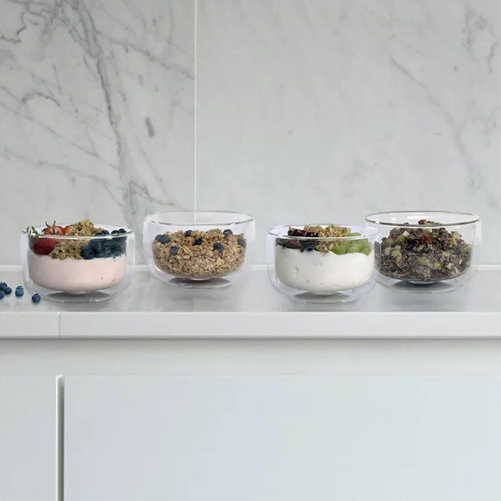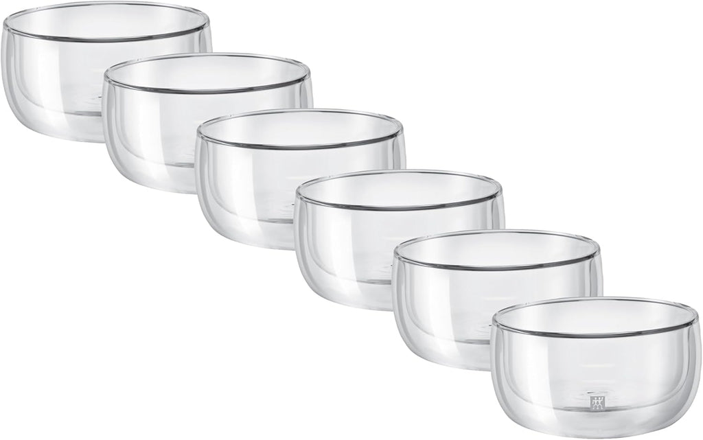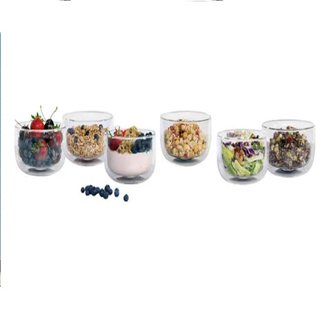 The HENCKELS 6‑Piece Double Wall Glass Bowl Set combines sophisticated European craftsmanship with smart design. Each bowl is expertly mouth-blown from high-quality borosilicate glass, making it lightweight, durable, and resistant to thermal shock. Whether you're serving ice cream, soups, snacks, or salads, these bowls are a stylish, practical choice. They're microwave safe for reheating and dishwasher safe for easy cleanup—making them perfect for both casual meals and entertaining.