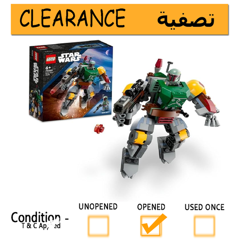 A Boba Fett LEGO minifigure – Boba Fett comes with a blaster rifle and jetpack accessory element. The blaster rifle can be clipped to the mech, and Boba can wear the jetpack in the cockpit
