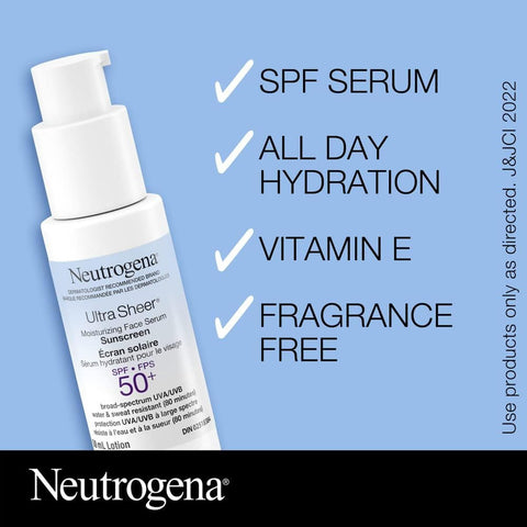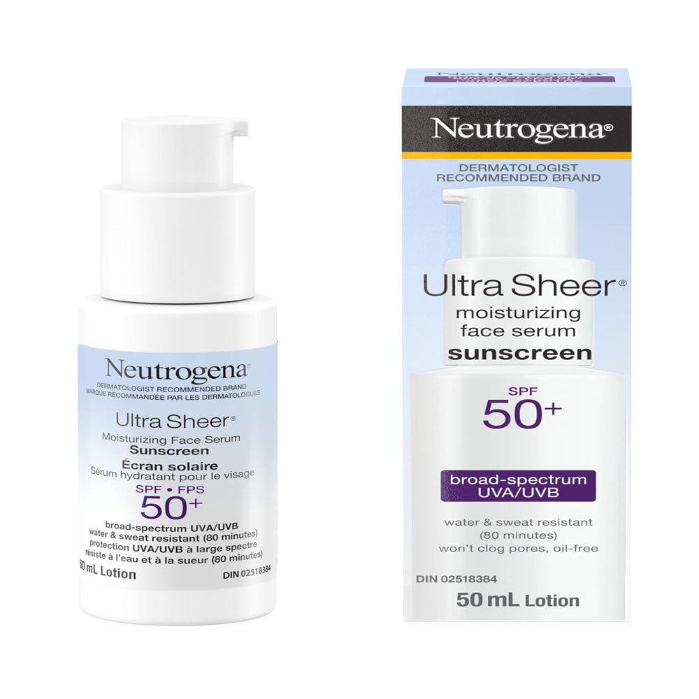- Neutrogena Ultra Sheer Moisturizing Face Serum Sunscreen SPF 50 moisturizes and helps protect your skin against sun damage. This product comes in a 50millilitre bottle of moisturizing face serum sunscreen with SPF50