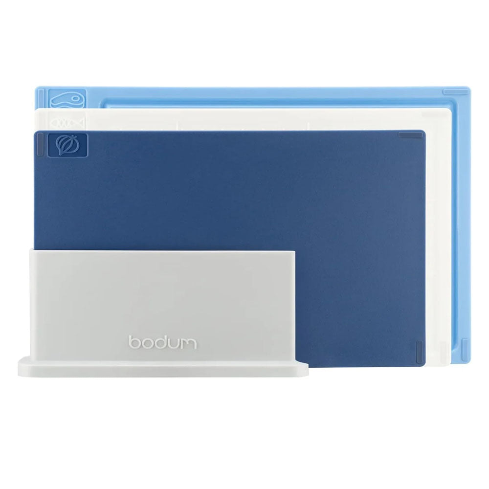 The BODUM Bistro Set of 3 Cutting Boards with Holder is a stylish and functional kitchen accessory designed to streamline food preparation and keep your workspace organized. It’s ideal for home cooks who want a reliable set of cutting boards that are easy to use, store, and clean