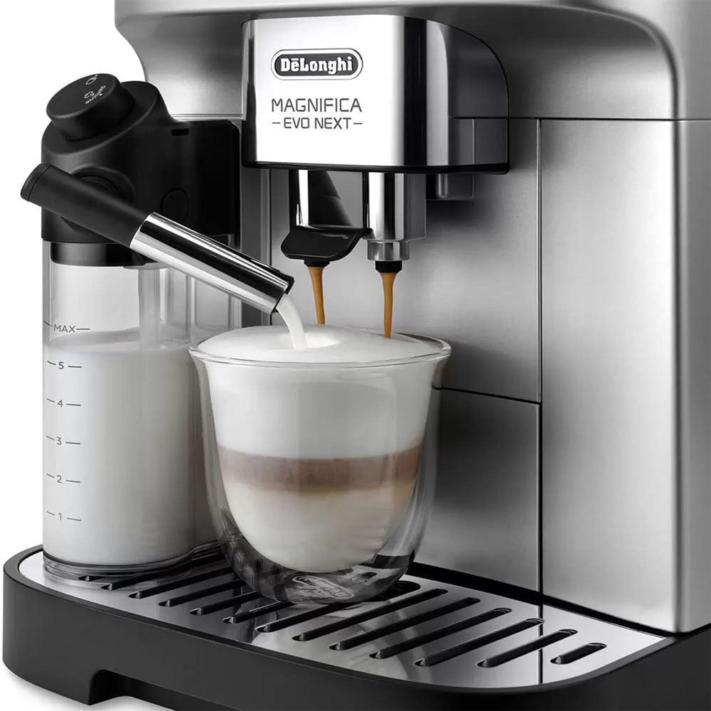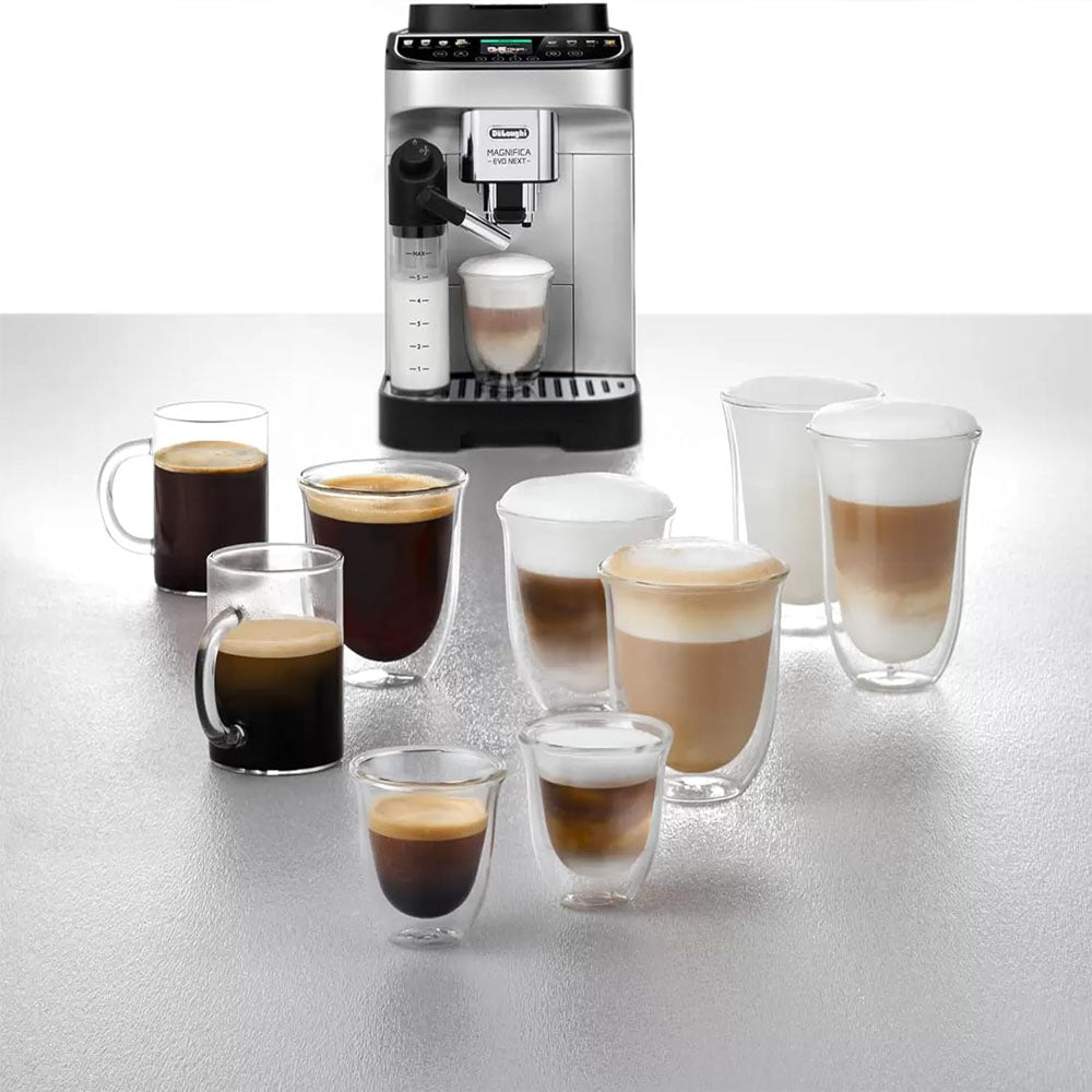 Magnifica Evo Next Embodies De'longhi Experience, Know-how And Technology To Always Offer The Best In Cup Result, From Bean To Cup.the New De'longhi Bean To Cup Coffee Machine Satisfies Every Coffee Taste With A User-friendly Interface, Where Coloured Icons, Coloured Tft Display, And Navigation Buttons Guide The User Into A Rich World Of 13 Coffee-Based Drinks. You Can Adjust Your Drinks Parameters Very Easily By Choosing Among 5 Sizes, 4 Levels Of Intensity And 3 Temperature Options. My Function Allows You To Get An Even More Customized Quantity .after Customizing Your Drinks, You Can Save Them On Your Profiles, So The Machine Will Know You And Your Tastes. Lattecrema Hot Guarantees A Dense Milk Foam Always At The Perfect Temperature For All Your Milk Drinks.