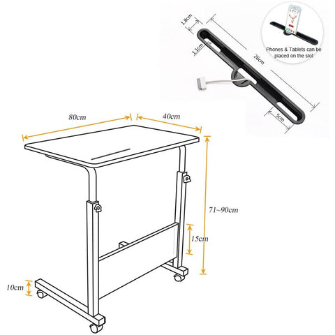 - Dimensions: 80L * 40W * 71-90H cm; table weights about 15.4 lbs (7kg); Max. Load: 66 lbs (30kg) ; With tablet slot