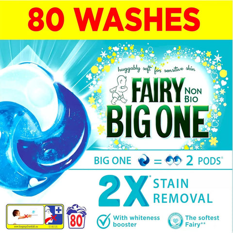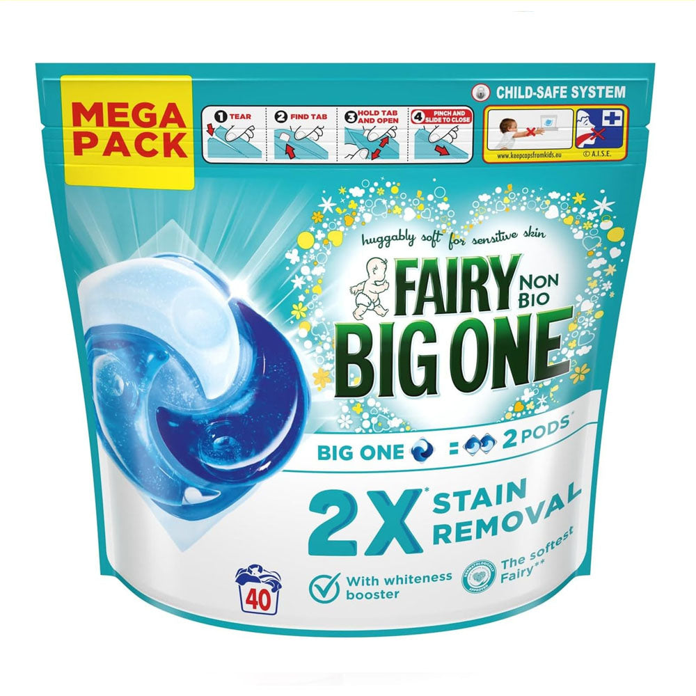 Fairy The Big One Non Bio Laundry Liquid Pods Are Packed With 2 X Stain And Odour Removal Power As The Performance Of Fairy The Big One Equals 2 Fairy Non Bio Pods. They Will Give You The Maximum Fairy Clean For Minimum Effort And Handles Even Adult-Sized Messes, Whilst Being So Soft On Sensitive Skin. They Are Enhanced With A Whiteness Booster And Are Designed To Work Well On Both Mixed And Fuller Loads. They Work Brilliantly Even In At Lower Temperature, Dissolving Fast Even In Cold Water And Providing Impeccable Results. For Best Results, Place The Pod First At The Back Of The Drum And Put Laundry On Top.