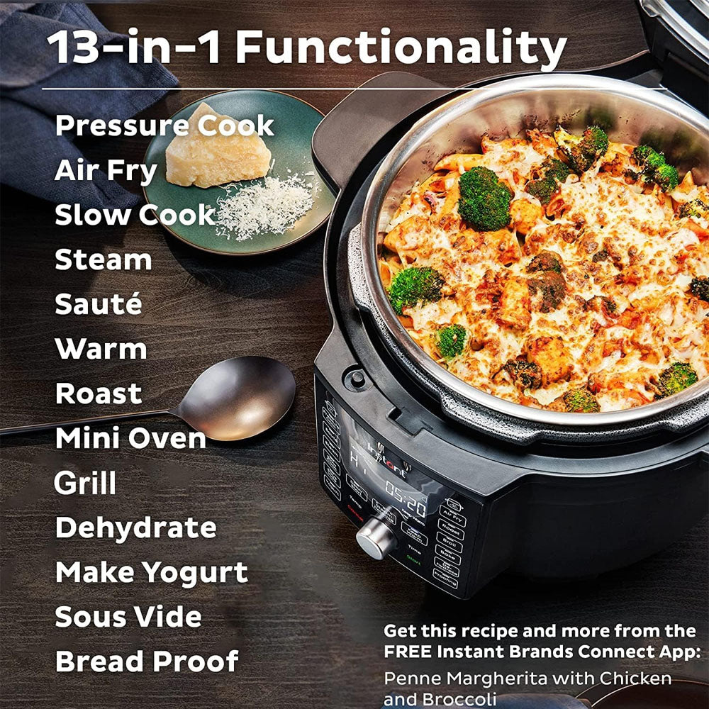 - 13-IN-1: Pressure cooker, air fryer, slow cooker, steamer, sauté pan, food warmer, roaster, mini oven, broiler, dehydrator, yogurt maker, sous vide, and bread proofing.
