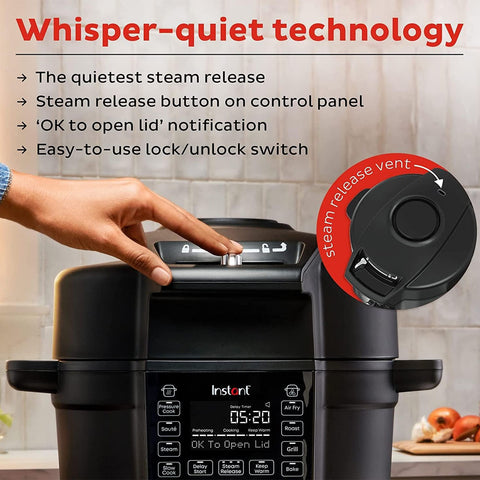 - STRESS-FREE: Steam release button on the control panel and ‘OK to open lid’ notification plus an easy-to-use lock/unlock switch.
