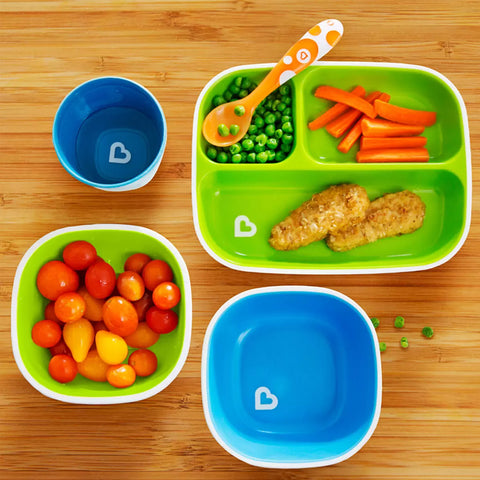 Each piece features thoughtful design details to encourage independence, with deep sides on plates and bowls for easier scooping, and wide‑base cups that help prevent tipping. The items nest together for compact storage and are top‑rack dishwasher safe, microwave safe, and easy to clean, making busy mealtimes a breeze for parents and caregivers.