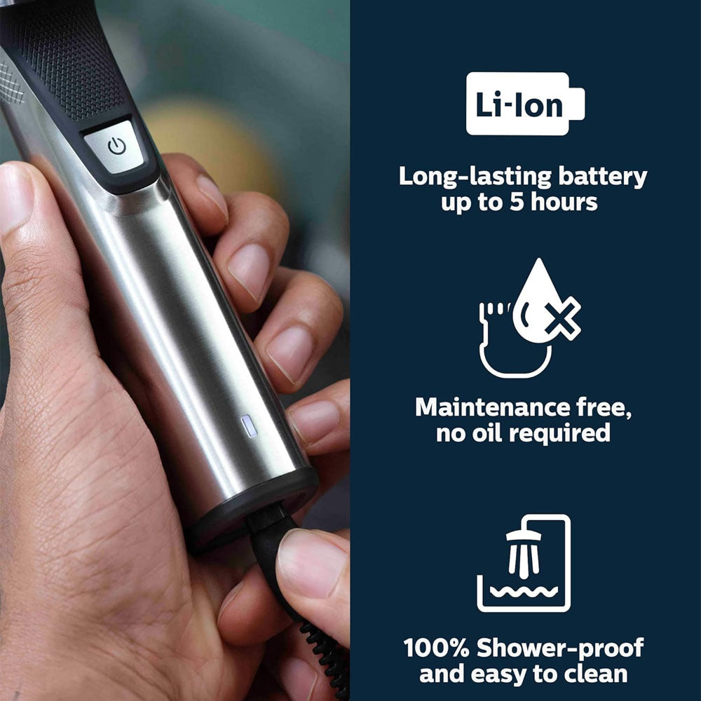 - Features body combs for body and intimate grooming.The steel frame and rubber grips deliver superior control and the Lithium-ion battery yields 5 hours of runtime.USB-A charging cable included (wall power adapter not included).Includes: 1 steel trimmer, 1 adjustable 1-3mm precision trimming guard, 1 adjustable 3-7mm guard, 1 steel precision trimmer, 1 nose and ear trimmer, 1 extra-wide hair trimmer.