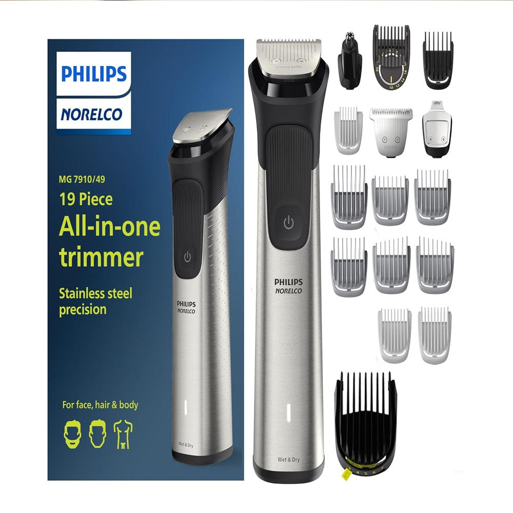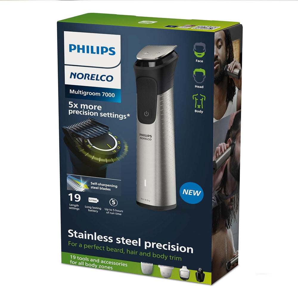 - The Philips Norelco Multigroom 7000 provides stainless steel precision with 19 tools and accessories for a perfect beard, hair and body trim.